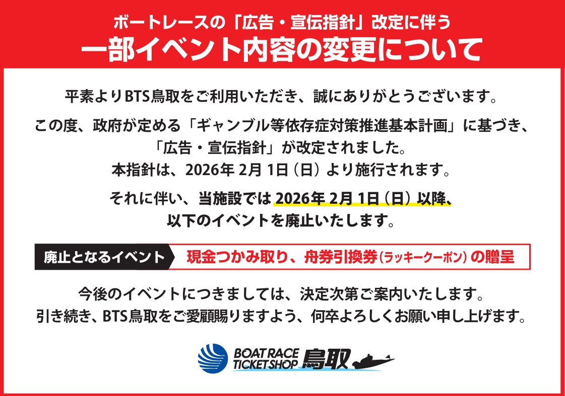 これまでボートレースは自分の考えで楽しめる健全な知的ゲームとして、多くのお客様に親しまれており、末永くボートレースをご愛顧いただくためにも、無理のない資金で、余裕を持ってお楽しみいただきたいと考えております。 勝舟投票券の購入にのめり込んでしまう等の不安のある方は、専門機関の紹介などを行っておりますので下記までご相談ください。 <ボートレースチケットショップミニボートピア鳥取 お客様相談窓口> TEL:0857-54-1100 応対時間(発売日のみ):10:00~閉場時間まで 【全国精神保健福祉センター一覧】 【独立行政法人国民生活センター(多重債務相談窓口)】