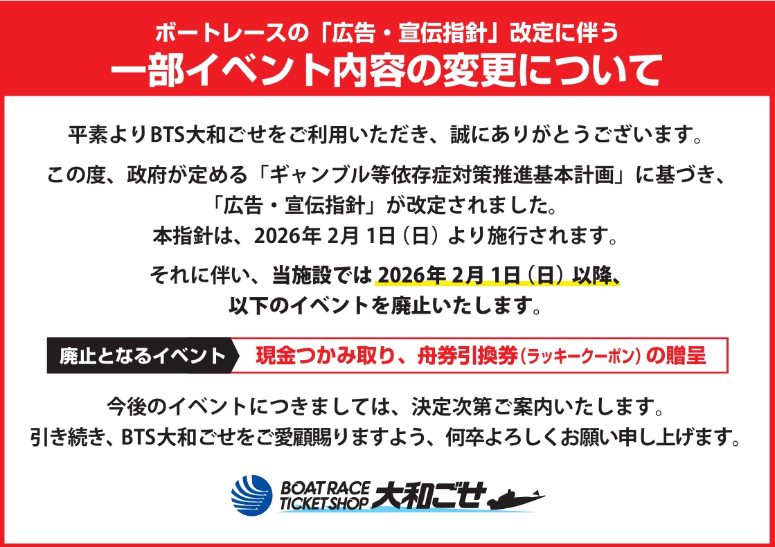 これまでボートレースは自分の考えで楽しめる健全な知的ゲームとして、多くのお客様に親しまれており、末永くボートレースをご愛顧いただくためにも、無理のない資金で、余裕を持ってお楽しみいただきたいと考えております。 勝舟投票券の購入にのめり込んでしまう等の不安のある方は、専門機関の紹介などを行っておりますので下記までご相談ください。 <ボートレースチケットショップ大和ごせ お客様相談窓口> TEL:0745-64-1500 応対時間(発売日のみ):10:00~閉場時間まで 【全国精神保健福祉センター一覧】 【独立行政法人国民生活センター(多重債務相談窓口)】